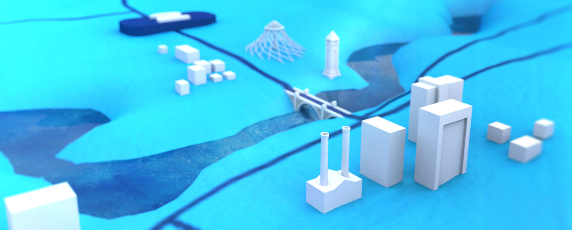 The buildings are stylized, symbolic, and have a purposeful low–poly, simplistic, feeling to them.