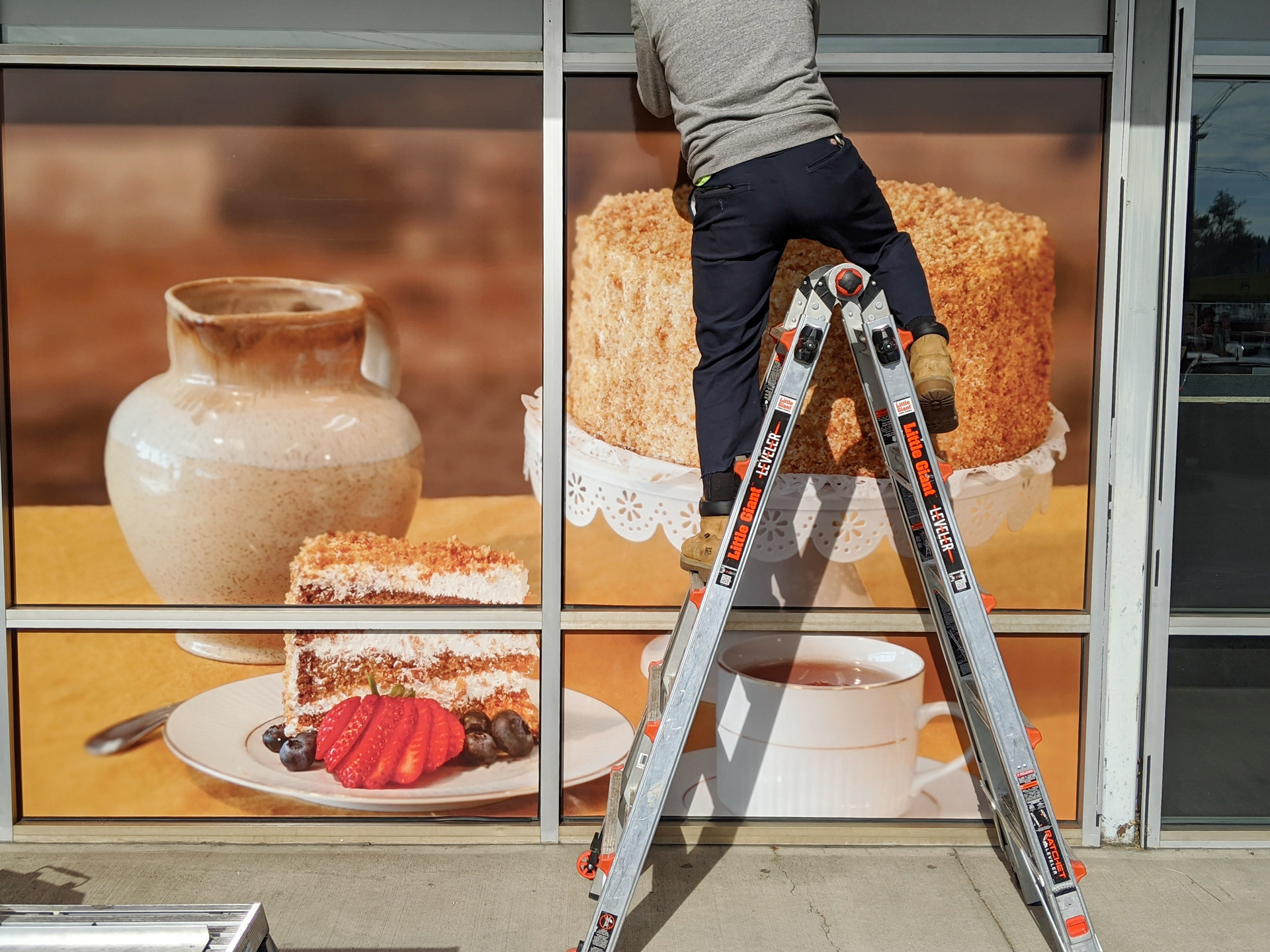 Cake photography, printed on vinyl, and applied to windows of a local business: